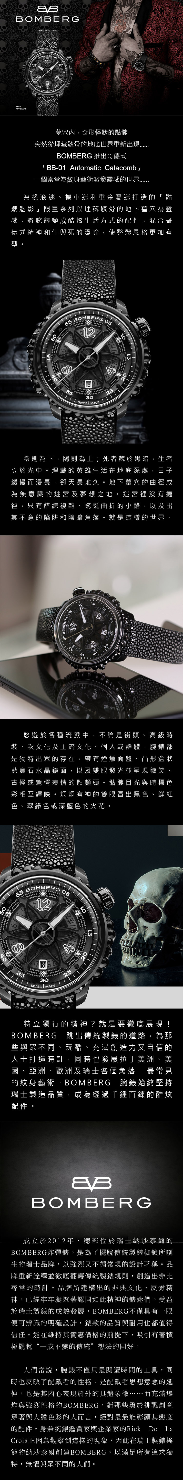 • 外觀:黑色PVD不銹鋼錶殼,錶徑43 mm,立體骷髏造型夜光錶殼,藍寶石水晶玻璃鏡面,防水50米