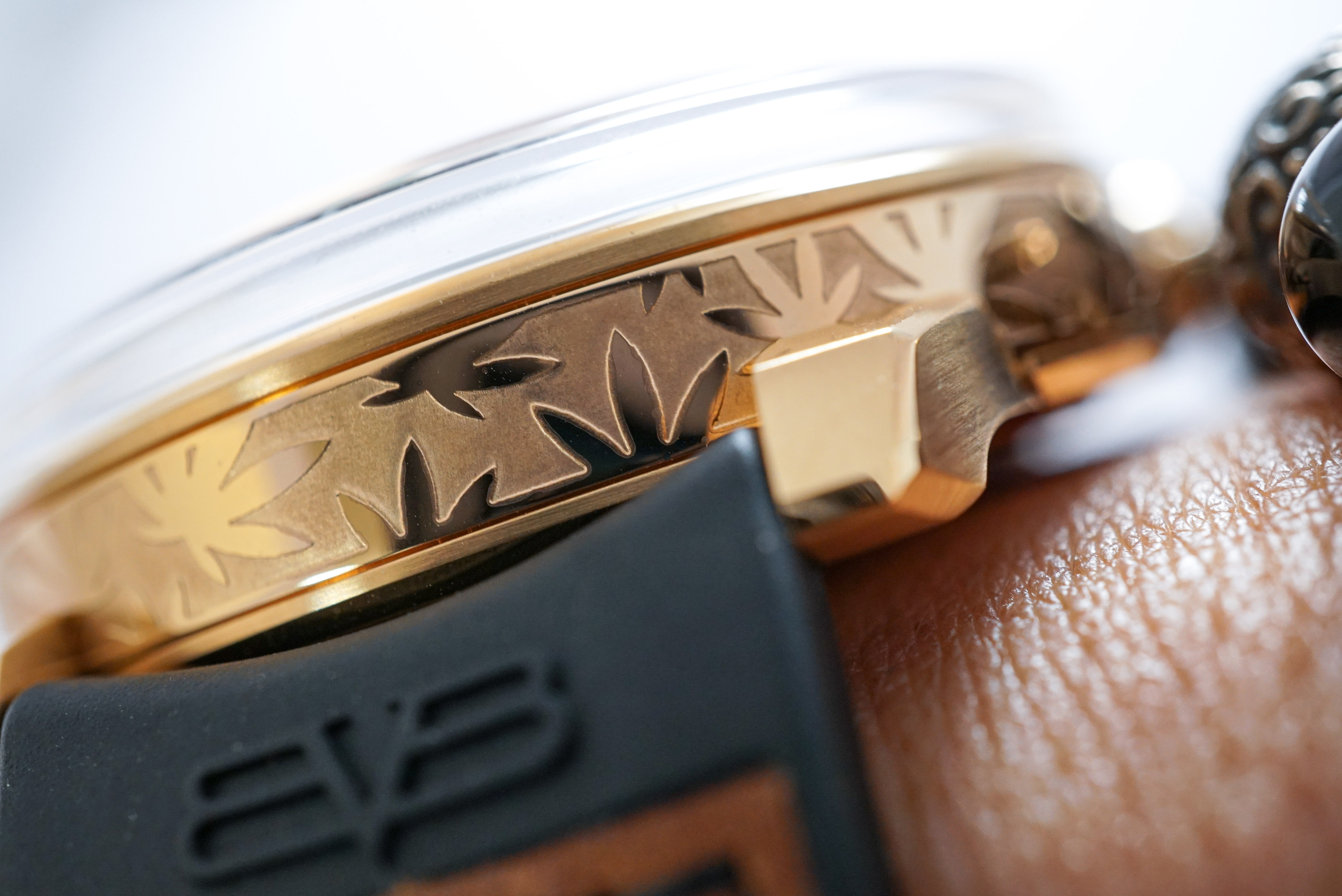 除了錶殼上的大麻元素,黑色縫線的皮革錶帶上也採用大麻壓花,呼應錶款的設計主題。咖啡色皮革搭金色錶身,呈現經典雋永的成熟風味。而為了提高配戴的舒適感,皮革錶帶還複合了橡膠內層,即便熱天配戴流汗,也不會對錶帶造成影響。