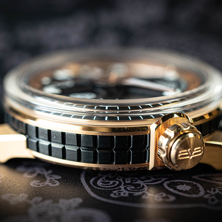 外觀:4N玫瑰金色PVD處理不銹鋼錶殼,錶徑43 mm,藍寶石水晶玻璃鏡面,防水 50米。
