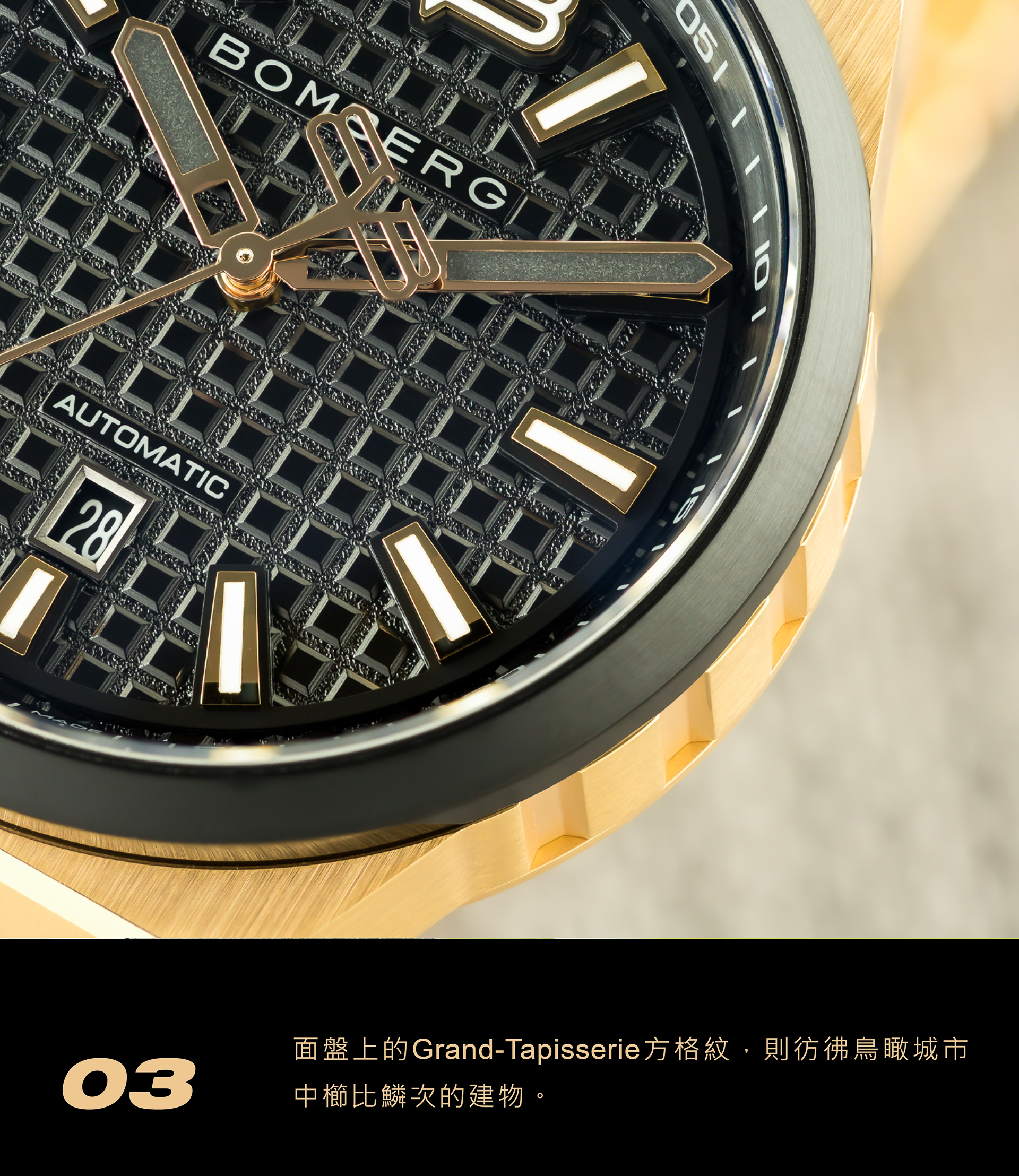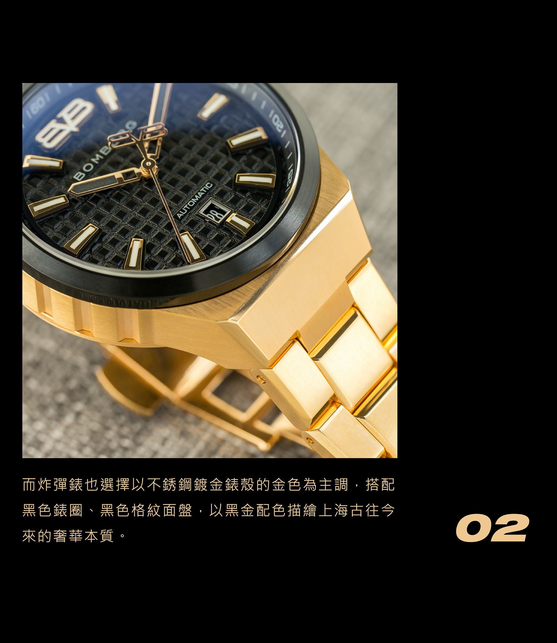 外觀 : 黑色DLC及金色PVD處理不銹鋼錶殼,錶徑43 mm,藍寶石水晶玻璃鏡面,防水100米
