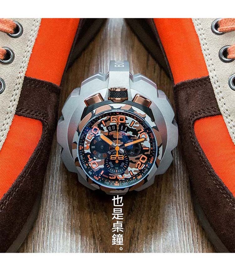 外觀:特殊多色DLC處理不銹鋼錶殼,錶徑45 mm,鏡面為高硬度礦物玻璃,表面有藍寶石水晶鍍層,防水100米