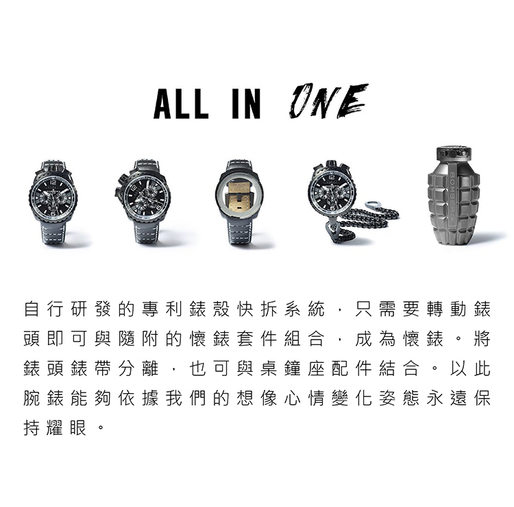功能:時、分、秒顯示,精確至十分之一秒計時碼錶功能,夜光塗層,小日期顯示,專利栓銷裝置,錶身可拆下,另組成懷錶