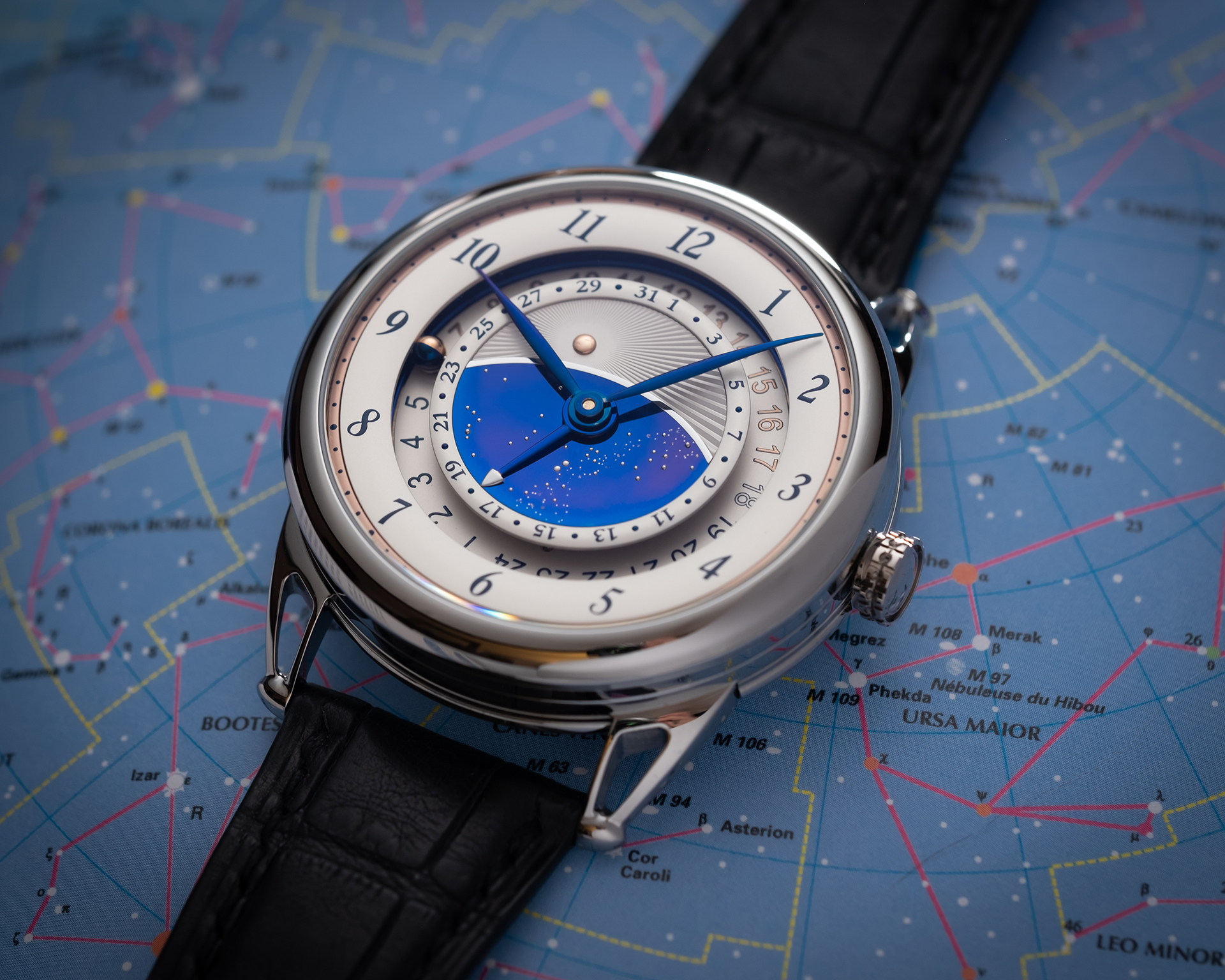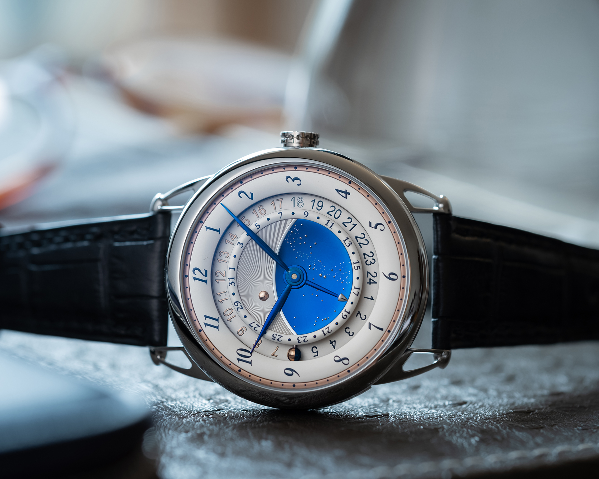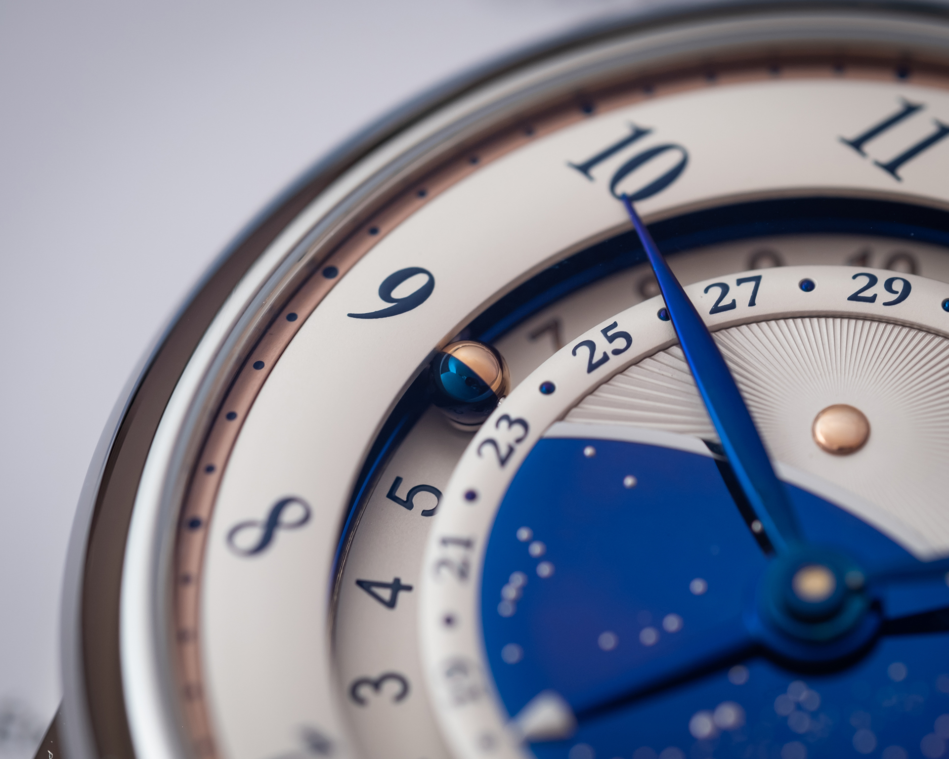 - 微型球體日夜指示,以5N玫瑰金與藍鋼製作,類似De Bethune專利球體月相。