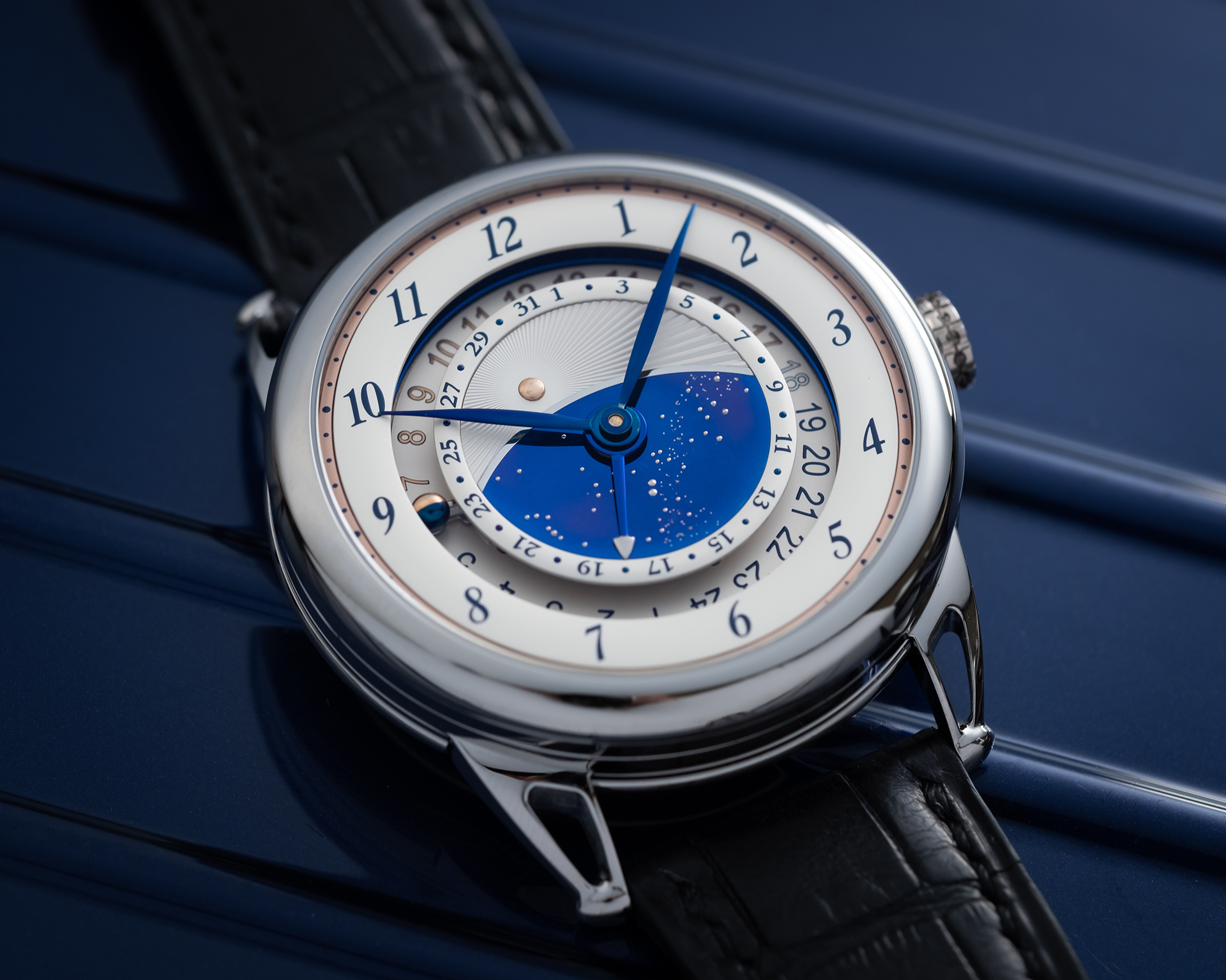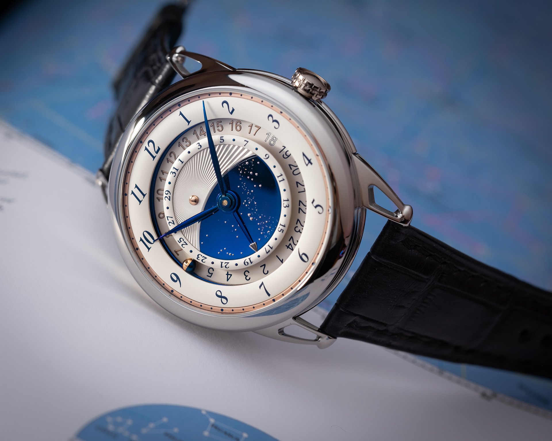 - 中央兩片式面盤,藍色拋光鈦金屬搭配金針星空。銀色微波裝飾(Microlight),鑲嵌拋光玫瑰金太陽嵌件