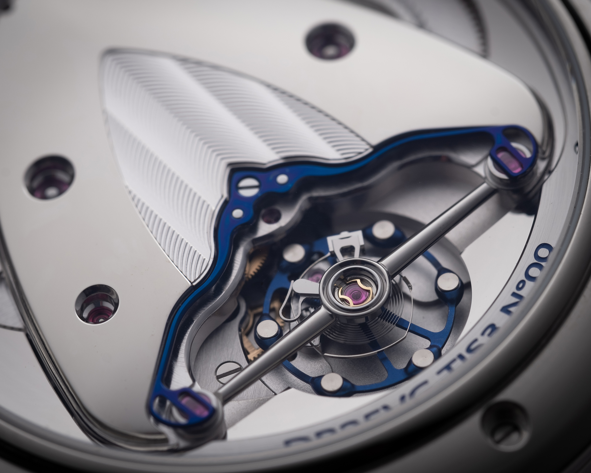 - 鏡面拋光不鏽鋼橋板,微波裝飾紋路(Microlight)“Cotes De Bethune“,De Bethune獨創結構(2016)。