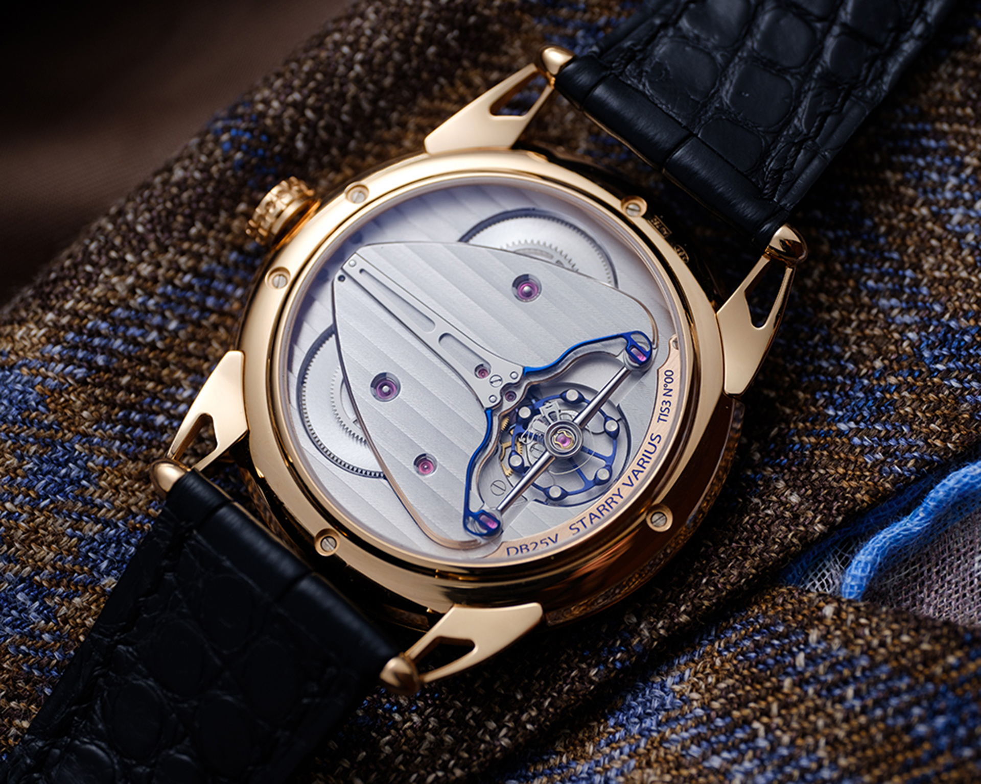 透過雙面防眩處理的藍寶石水晶底蓋,能見到De Bethune以最新技術所打造的精湛機芯。DB25 Starry Varius 玫瑰金以品牌自製的 DB2005 手上鍊機芯驅動,每小時振頻28,000轉。這枚機芯完全由 De Bethun e工坊自行研發、製作、生產,並配備了全新鈦金屬擺輪以及獨家三重減震系統。