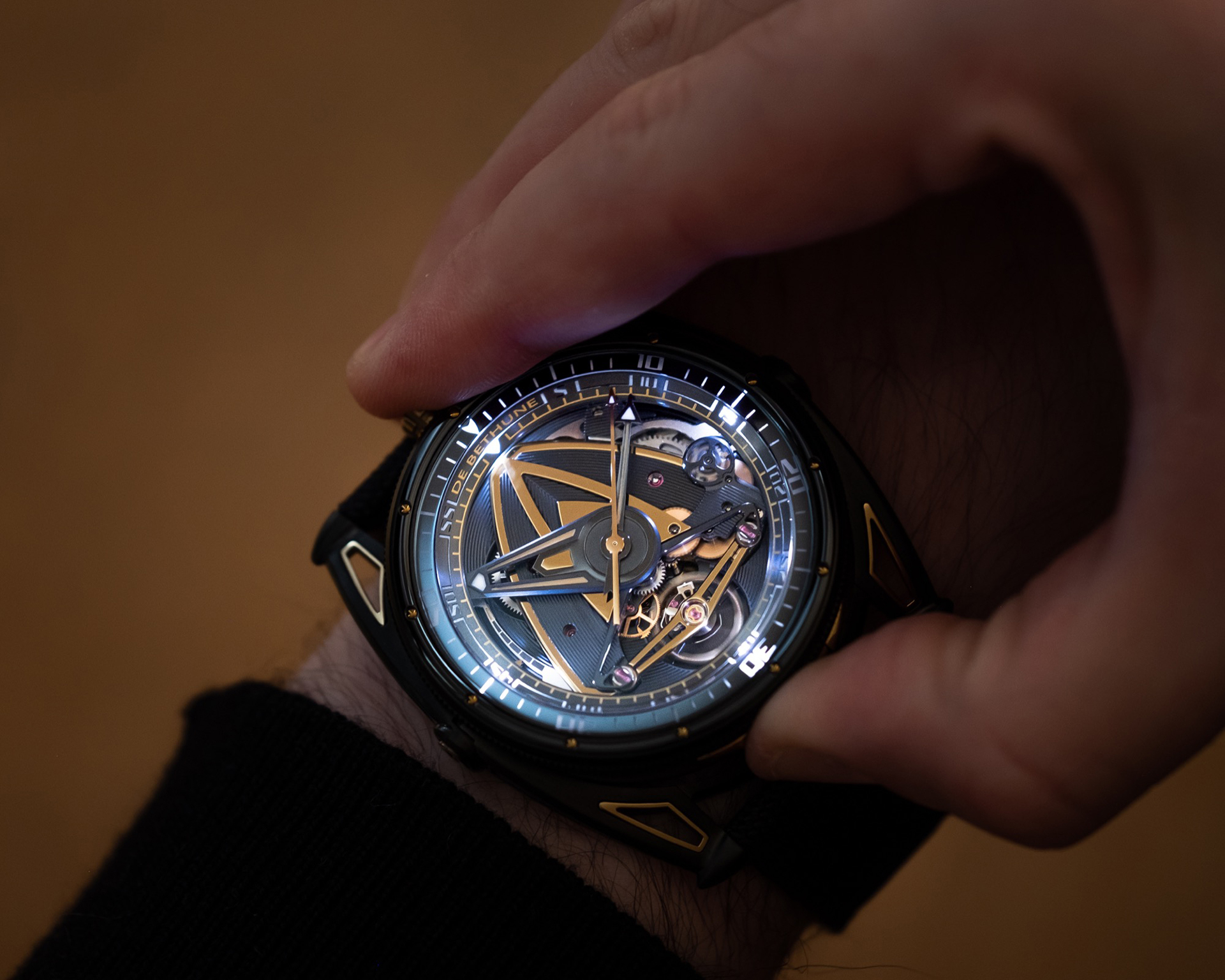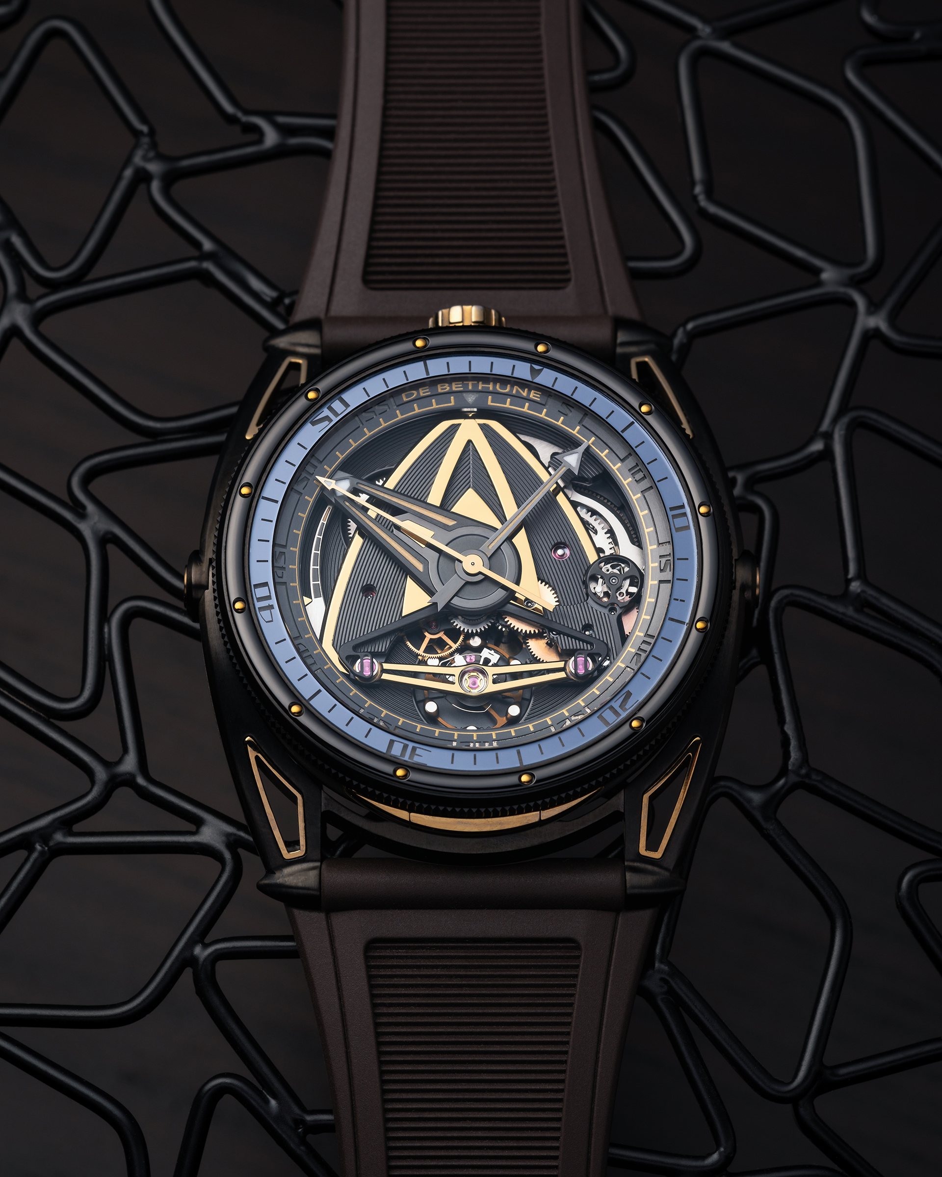 設計上,不單只在殼身拋光與啞光、深灰色與黑色之間的細節編排,同時也需要思考如何善用熱氧化黃色鈦金屬所帶來的金色調--這同時也是展現De Bethune在透過熱氧化技術為鈦金屬調色的專業實力展現,藍色一直是品牌非常有開創技術與歷史意義的指標色彩,如今轉為探索金黃色澤。完成如此成果,需要全新研發技術的輔助。而這些全都由Denis Flagellet與整個團隊共同研發,如今也以實際成果向這個令人敬佩的新時代致意。