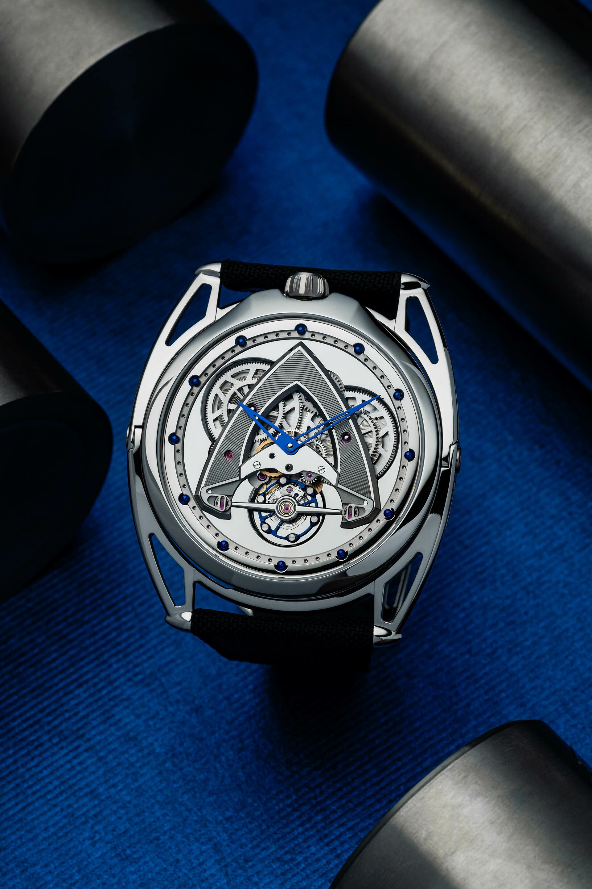 此外,以獨家擺輪設計造型為靈感的12枚拋光藍鈦球體環繞於外側,除了作為小時時標之外,也巧妙的呼應De Bethune的標誌。而經過藍鋼化處理的鈦金屬中央時、分指針,也是品牌極具代表的特色。