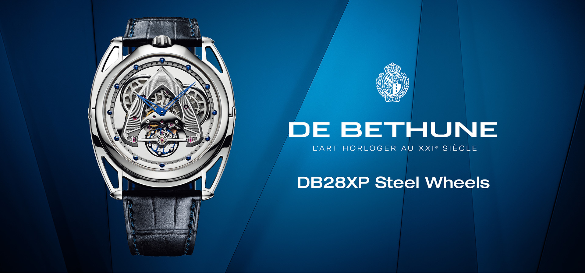 強調透明輕盈感的DB28 Steel Wheels於2018年首度問世,通透的面盤將機芯的獨特架構展現於世人面前。採用De Bethune特色的三角箭形橋板,搭配六點鐘位置的球體月相,加上各種造型特殊的零件,為錶款注入現代建築風味,成為品牌最具代表性的設計之一。而今年全新出發的DB28XP Steel Wheels,則將此精神再度傳承於世。