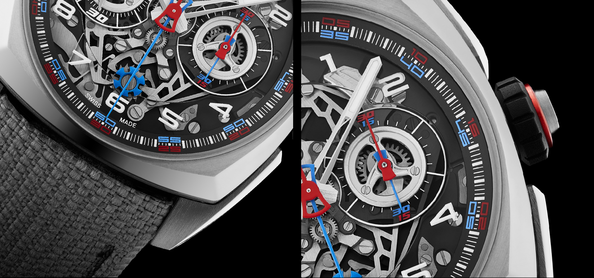 • 3 點位置的 30 分鐘計時盤:煙燻色防反光藍寶石水晶玻璃,每隔 5 分鐘有夜光標記,紅色和藍色指針,15/30 分鐘雙指示,與兩組獨立計時碼錶相對應