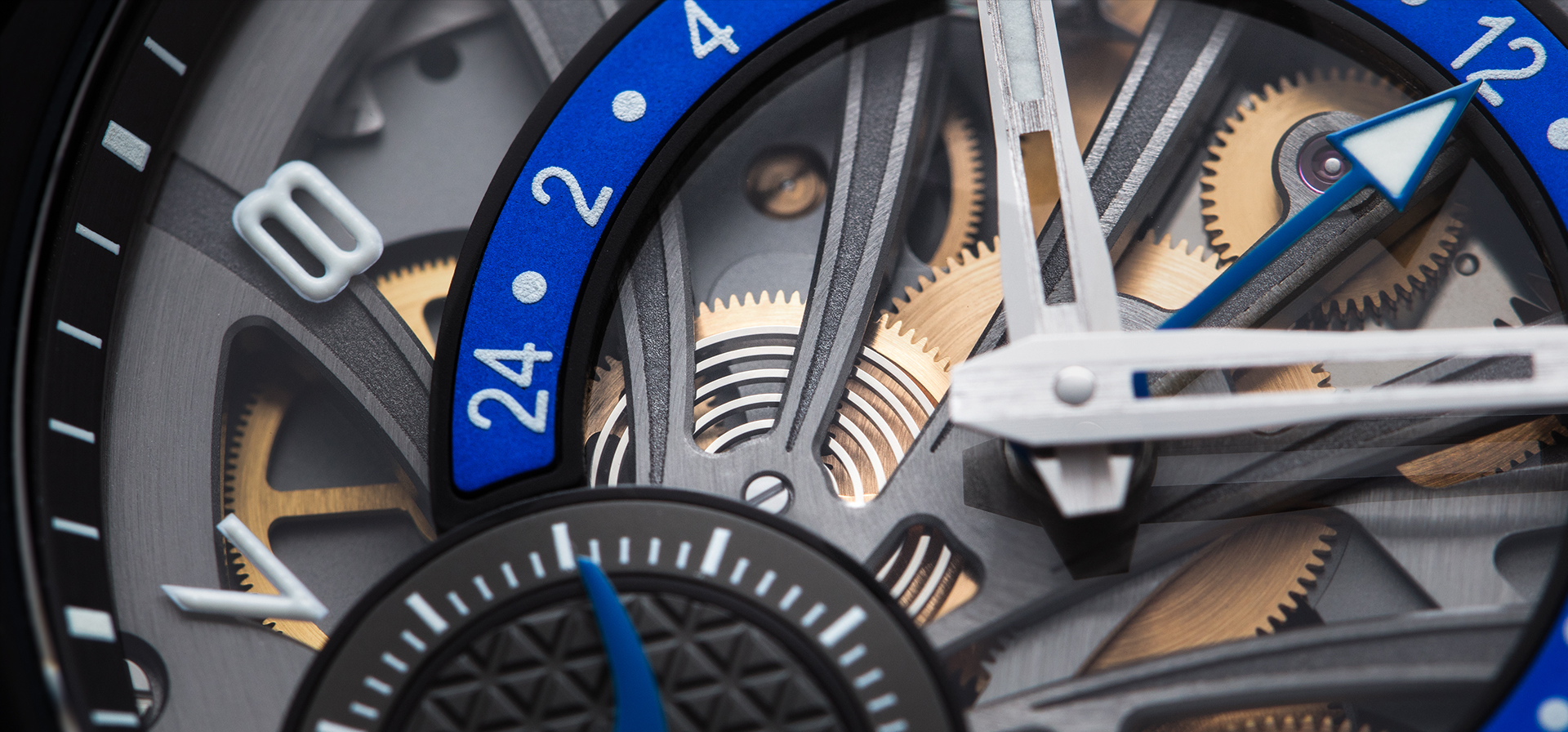 而越過藍寶石水晶盤,也能直視機芯上層。鏤空機芯向外散射,且略帶弧度的骨架,連結了小時時標,彷彿由下向上承托著中央藍色漆面的 24小時制第二地時區數字環。夜光數字時標,讓光線昏暗時同樣提供較好的辨識度。採用逆跳小時指示,第二地指針由面盤七點鐘位置出發,行至五點鐘位置時在逆跳重新指示。也騰出了安置回力鏢型秒針指示盤。