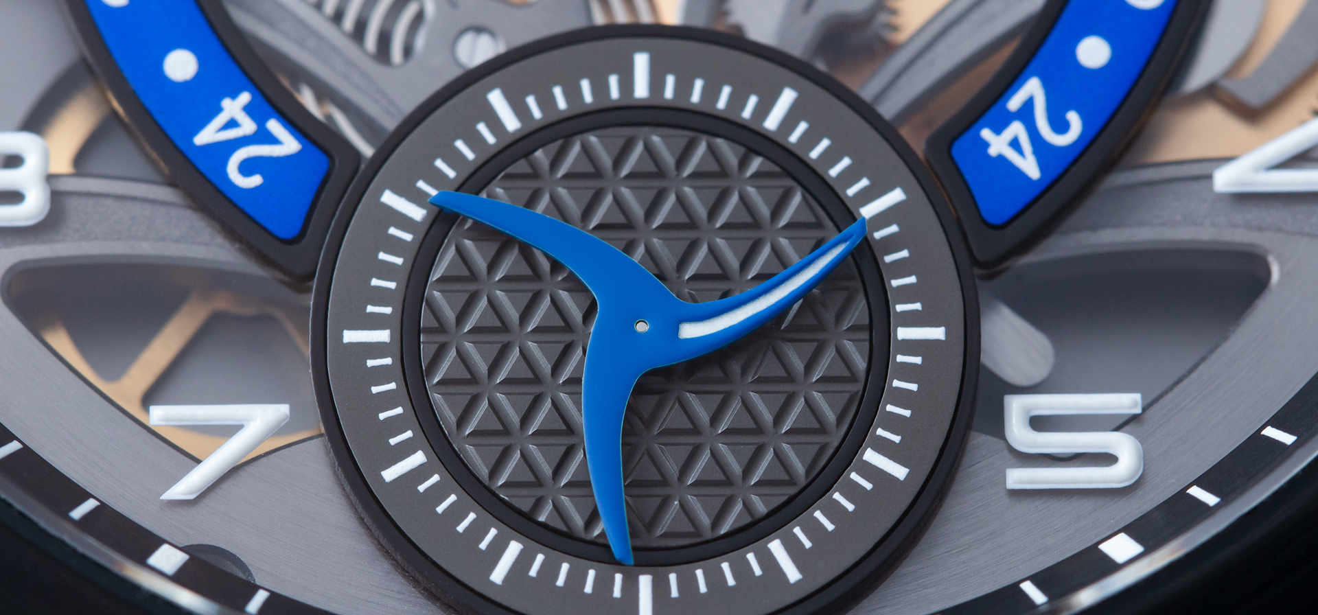 面盤元素多元,乍看之下非常複雜。然而,CYRUS 向來強調設計的和諧,且能夠直觀操作。中央的主要時間指示,指出所在地時間,以新設計的鏤空鍍銠指針指示。而第二地時間指針則是下方的藍色指針,對應藍色的第二地時間環,讓配戴者能清晰分辨。