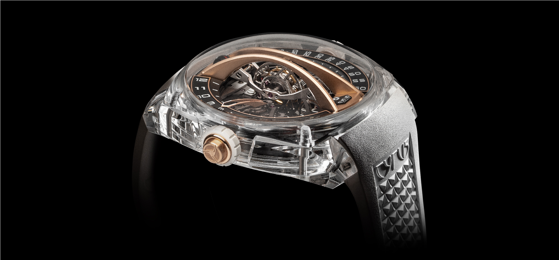 面盤上18K 4N玫瑰金拱形垂直夾板的設計靈感源於達文西(Leonardo da Vinci)的橋樑設計。錶殼的透明度有助演繹這一獨特結構,橋樑以對稱方式將面盤劃分為小時和分鐘兩個部分。由於這種佈局,腕錶在左側帶有夜光阿拉伯數字的黑色弧型面盤上顯示瞬跳的逆跳小時時間,而在右側弧形面盤上則顯示分鐘讀數。時針和分針覆有 Super-LumiNova 夜光塗層,在黑暗條件下也可以清晰易讀。5秒間隔刻度的秒數指示在陀飛輪框架上清晰可見。在陀飛輪夾板的兩個拱形橋梁結構之間,一個直徑5 毫米的黑色球體位於12 點鐘位置,它負責顯示動力儲存的狀態(1-4日)。為了保持面盤的視覺平衡,6點鐘位置設置有CYRUS的品牌標識。