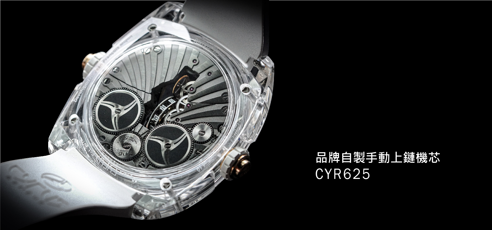 CYR625自製手動上鏈機芯的3D結構由厚度1.2 毫米量身訂製的穹形防眩藍寶石水晶鏡面保護,振頻為 21.600 vph 並提供超過100 小時的動力儲存。