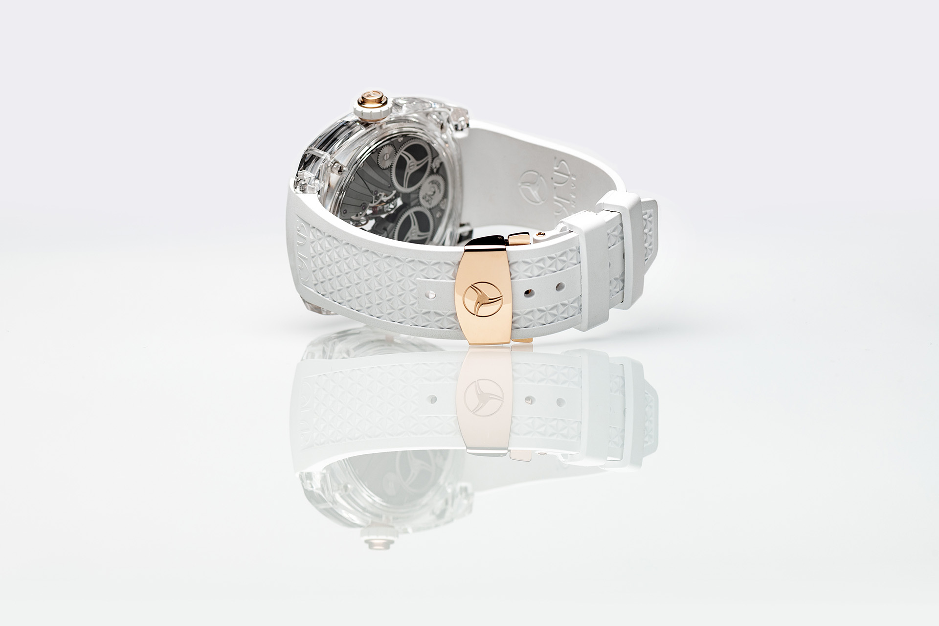 這款新時計搭配飾有全新壓花菱形圖案的白色橡膠錶帶,並配飾有 CYRUS 標誌的 18K 4N 玫瑰金摺疊錶扣。