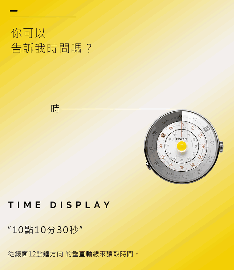 • 錶盤時間顯示:三個同心圓盤轉動,沿著錶盤頂端的垂直線指示時間。