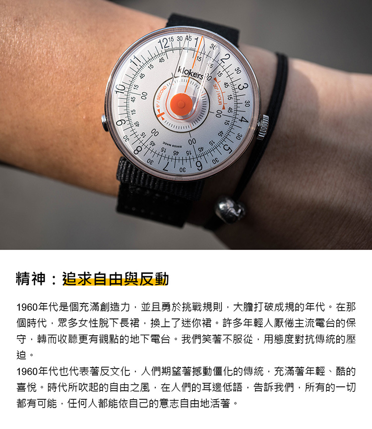 特色:兩個同心圓盤轉動,沿著錶盤頂端的垂直線指示時間。外圈顯示小時及跟分鐘,內圈顯示秒。