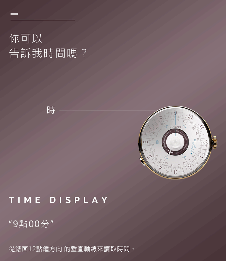• 兩個同心圓盤轉動,沿著錶盤頂端的垂直線指示時間。外圈顯示小時及跟分鐘,內圈顯示秒。