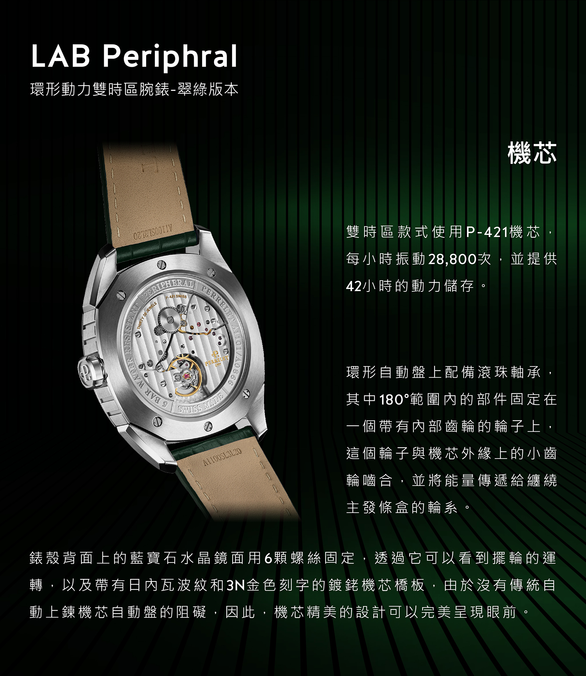 機芯:P-421自製自動上鍊機械機芯,動力儲存42小時,位於正面的環形自動盤