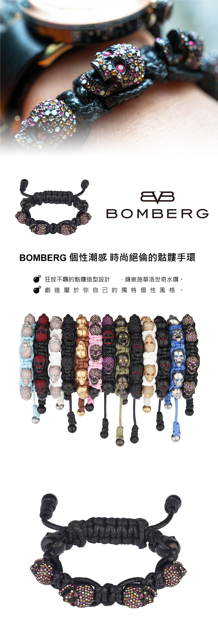 - BOMBERG|彩色水鑽黑骷髏黑色手環*1