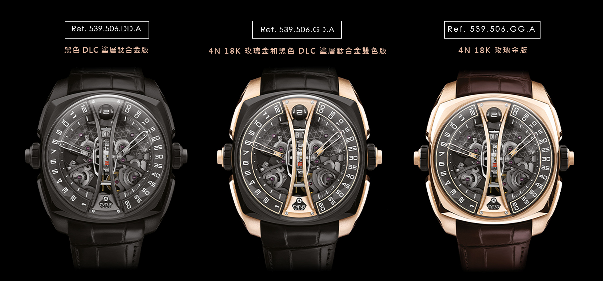 KLEPCYS VERTICAL SKELETON TOURBILLON 共推出三個款式,每款均限量 5 枚:經過黑色 DLC 塗層處理的 5 級鈦合金版本,4N 18K 玫瑰金版,以及 4N 18K 玫瑰金搭配黑色 DLC 塗層鈦合金錶殼的雙色版本。鈦合金版和雙色版搭配的都是黑色鱷魚皮錶帶以及飾有黑色 DLC 塗層的鈦合金摺疊錶扣。而玫瑰金版則搭配的是棕色鱷魚皮錶帶和玫瑰金摺疊錶扣。