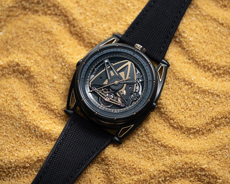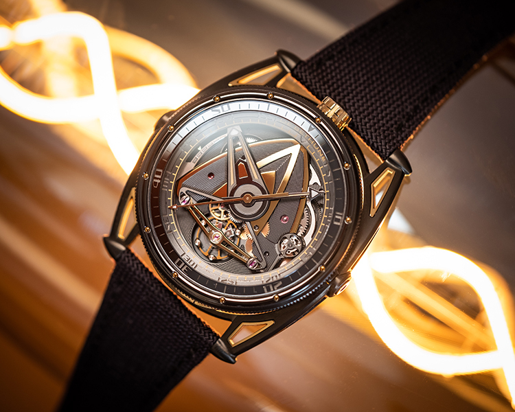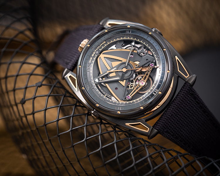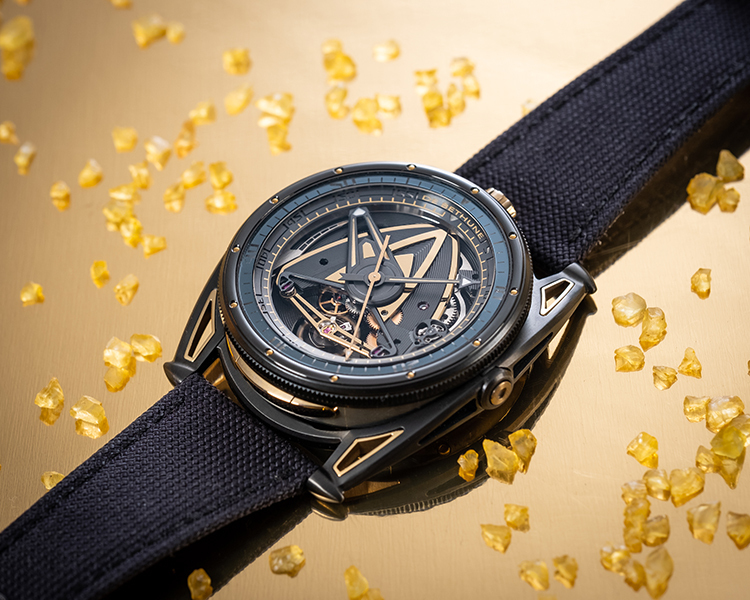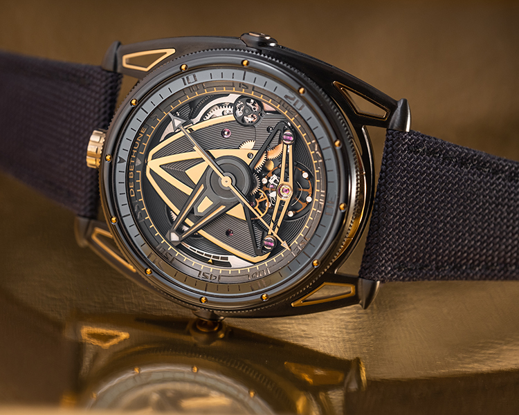 設計上,不單只在殼身拋光與啞光、深灰色與黑色之間的細節編排,同時也需要思考如何善用熱氧化黃色鈦金屬所帶來的金色調--這同時也是展現De Bethune在透過熱氧化技術為鈦金屬調色的專業實力展現,藍色一直是品牌非常有開創技術與歷史意義的指標色彩,如今轉為探索金黃色澤。完成如此成果,需要全新研發技術的輔助。而這些全都由Denis Flagellet與整個團隊共同研發,如今也以實際成果向這個令人敬佩的新時代致意。