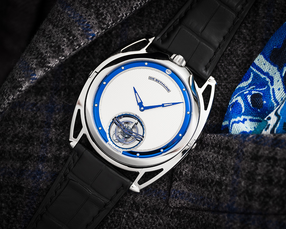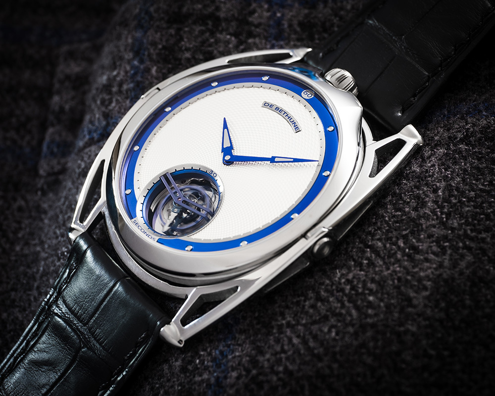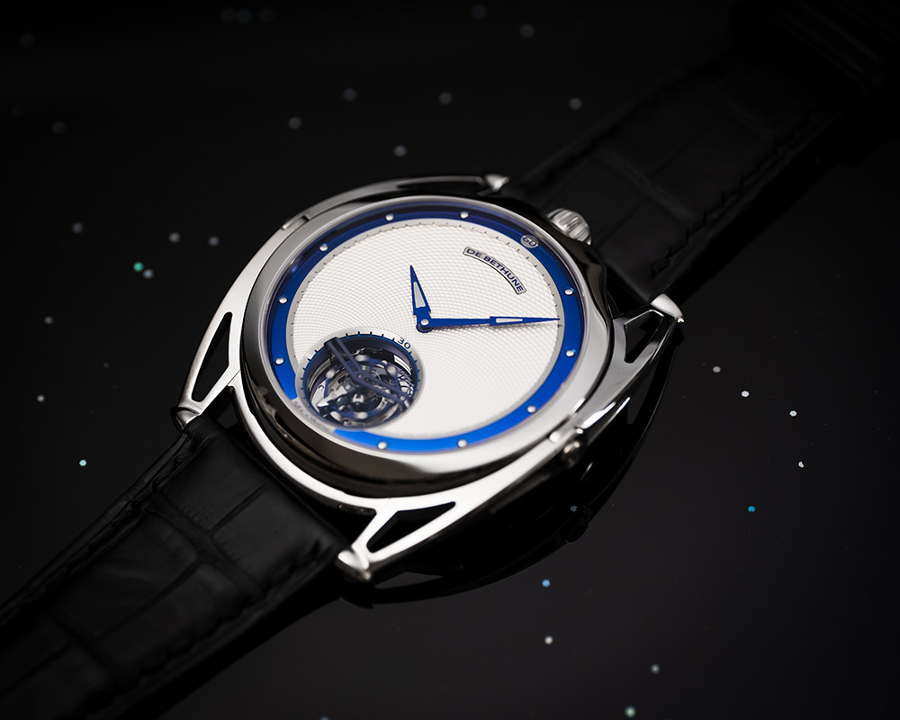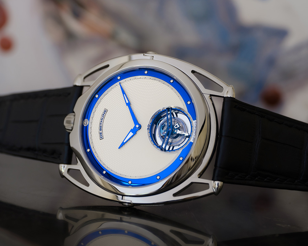 機芯De Bethune 自製手動上鏈機芯,5天動力儲存,鈦金屬擺輪、專利De Bethune 游絲系統、鈦金屬框架30秒陀飛輪